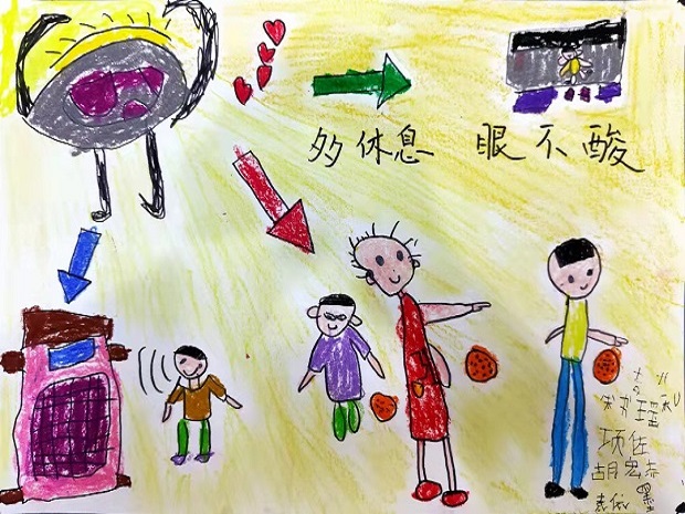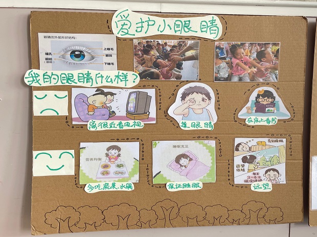 中班级组则是通过家园合作,将爱眼知识落实到每个家庭。通过儿歌、绘本等形式让孩子们了解近视眼是怎样形成的,让每位幼儿亲身体验眼睛的重要作用,从而懂得要爱护眼睛,知道用眼卫生。让护眼行动从小做起,从现在做起。