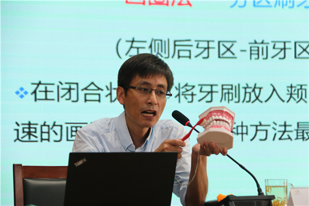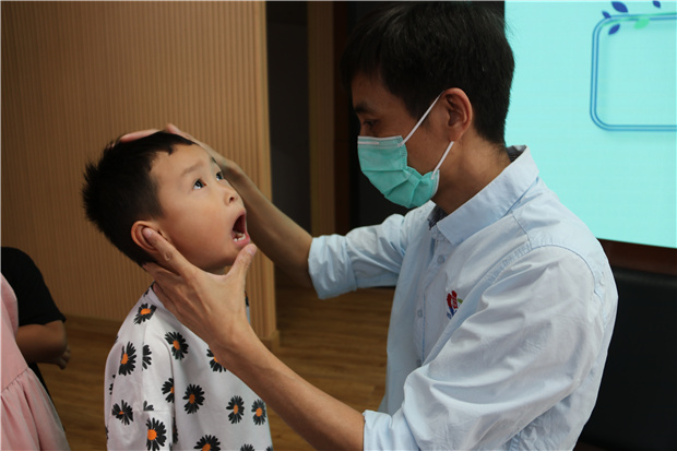 活动伊始,秦医生积极与孩子们互动,抛出“我们一共有几颗牙?”、“一天刷几次牙?”和“刷牙需要多长的时间?”等问题,为幼儿解开口腔健康的秘密。随后,他以生动形象的图片与解说,让孩子们知道现在的牙齿叫乳牙,有20颗,它们还有非常大的本领,如咀嚼食物、恒牙向导、辅助发音和审美作用。讲座中,围绕幼儿护牙的最大问题——龋齿的产生,秦医生也做了十分详细的介绍。在了解了龋齿产生的原因和带来的危害,孩子们都十分好奇怎么保护牙齿呢?于是秦医生介绍了五个护牙小方法,分别是:定期口腔检查、合理进食原则、局部使用氟化物、掌握护牙小知识和有了龋齿及时去医院治疗,希望孩子们养成“少吃甜食”、“餐后漱口”、“早晚刷牙”的好习惯。活动最后,秦医生还邀请了每个班级三个小朋友进行现场检查和建议。