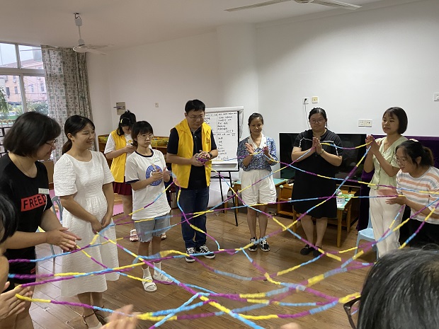 活动在线团游戏中接近了尾声,阮老师与大家围成圆圈以“抛毛线团”的形式来分享自己对今天培训的感悟。教师们发自内心的话语,深深吸引并打动着每一位细细聆听者,一种不由自主的心灵共鸣化成了一阵阵热烈的掌声。
