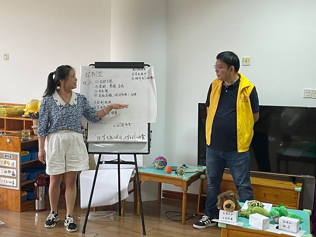 “孩子什么样的行为会让你觉得心烦、担心、愤怒、被挑战......”“不听话、无回应、哭闹、说谎.....”老师们各自结合自身实践积极回应,阮老师从中罗列孩子的行为并进行了分类。紧接着由四组老师通过情境表演让大家了解孩子行为背后的目的,并在此基础上帮助寻找解决的方法与策略。