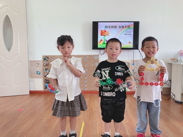 小班——自主拼插,快乐无限:小朋友利用雪花积木自由拼插,孩子们用他们的小手拼出各种有趣的造型:飞机、手枪、房子、小花、小碗……都是孩子们喜欢的样子。雪花积木拼插活动,不仅锻炼了小班孩子的手部肌肉,同时提高了幼儿的动手能力,幼儿在玩中乐,深受幼儿喜爱。
