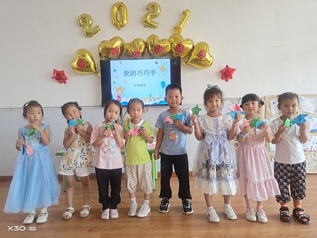 中班——折纸世界,精彩无限:折纸活动变化多样,孩子们小手翻飞,认真地完成每一个作品,五颜六色的彩纸在他们的手中变出了房子、鲸鱼、水杯、青蛙、兔子、小鸟等生动形象的物体。折纸活动既能让孩子体验成功的喜悦感,又愉悦了孩子的身心,同时促进孩子们的手眼协调能力。