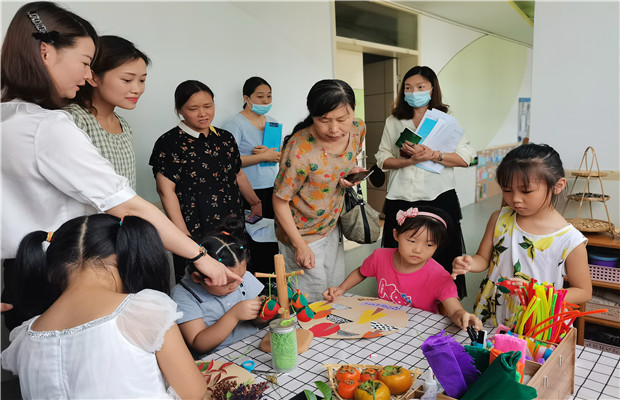 集体活动之后,庄老师在赵腊梅园长的陪同下和姐妹园的老师们一起游走式观摩了春幼大班各教室。春幼各大班的区域游戏活动开展的正是如火如荼,孩子们玩得尽兴而投入,每个班级都能够体现出各自的特色和精彩。比如大三、四班的扎染和青花布美工区主题,孩子们学习染布、画布,用制作好的布料尽兴多种创意美术;大五、大六班、大七班的角色区,孩子们用各种表征表达自己的已有经验,与同伴有序的游戏;大一、大二班的阅读区、科学区、益智区能够呈现幼儿的问题式墙面,展示幼儿经验的成长变化。