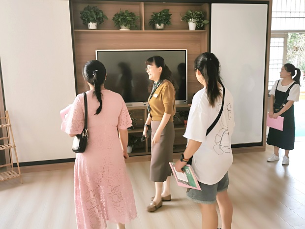 小4班是暑期新改造的教室,在总务主任张琴娣老师的带领下,她向各位成员介绍了设施设备的采购、施工改造的细节、施工材料的质量、环保检测等。详细的讲解,过程中的交流,打消了后期搬入新教室家长们的顾虑。