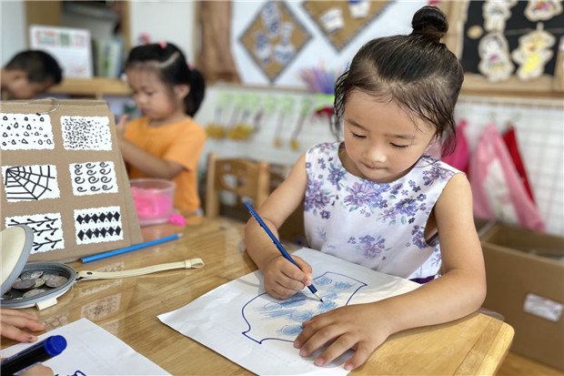 传统文化积淀着人民群众的生活智慧,是中华民族强盛不息的内在基因。走进《中国娃》主题,各班以丰富多样的形式展开活动,加深幼儿对传统文化的认识。最美青花,在蓝白相间的纹理中感受江南青韵的古色古香;京剧脸谱大联盟,在谈话分享、绘制脸谱以及京剧表演中感受国粹的魅力;趣味扎染,通过欣赏、感知扎染与图案之间的关系,感受扎染艺术的魅力……孩子们在班本课程推进中,更深刻地了解不同的民俗工艺,进一步丰富对我国传统文化的感性认识,从而让每一个孩子都为自己是一个中国娃而自豪!