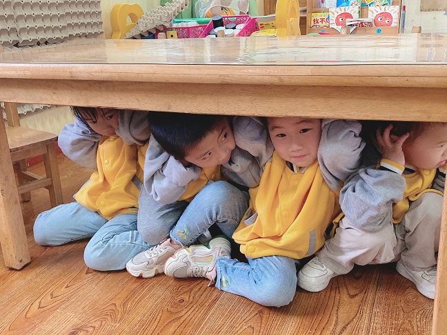 当“地震警报”响起,教师立即停止活动,告诉幼儿“地震来了、不要慌”引导幼儿卧倒或蹲下躲到桌下或墙角,并用手部保护头部和颈部。待警报停止后,教师迅速组织幼儿紧张有序的撤离,按照疏散路线离开教室到户外安全地并清点人数。在疏散过程中,各楼梯处有保育员随时救护,以防幼儿跌倒、推挤现象,保证全体幼儿安全撤离。演练结束后由各班老师向园长汇报人数,在大家的密切协作下,此次防震演练圆满完成。