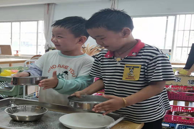 孩子们带着甜美的糯米粉和馅料来到幼儿园一起制作重阳糕。你选一个圆圆的浅口盘子,我用筛子把糯米粉细细的晒到盘子里,一起在中间按出一个小房子,让甜甜的馅料住进去,然后再接着筛米粉、压实,最后在上面放上核桃、芝麻等。