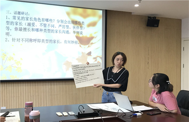 老师们以具体案例分享了自己与家长沟通的小故事,而后根据老师们的分享,一起梳理出四种类型的家长,分别是:溺爱型、不管不问型、严厉型、伙伴型。针对不同类型的家长,老师们分成两组进行研讨,说一说针对该类型家长有何沟通技巧和妙招。在探讨中,老师们的思维产生碰撞,各抒己见,最后梳理提炼出相关经验,如:面对不管不问型家长,我们可以主动联系家长,寻找前后原因;热情参与幼儿园活动(邀请家长);在班级群里及时肯定家长积极鼓励的行动;邀请家长参与亲子活动,表达对家长强大的需要。以上经验让老师们深受启发,受益匪浅。主持老师也非常用心的分享了与家长沟通的一些沟通技巧和术语,可以用于后期的家长工作中。