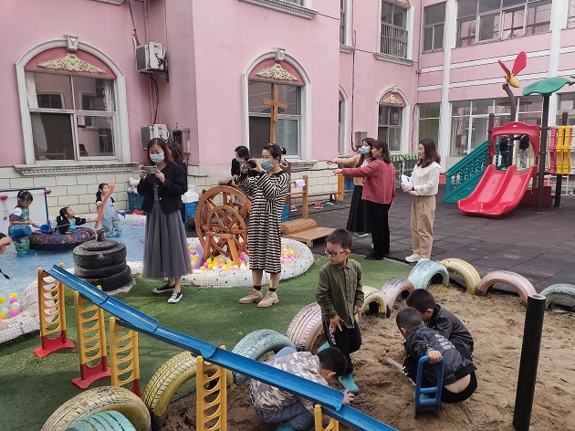 李锦秀园长代表全体小幼对同行们的到来表示了热烈的欢迎。来宾们在王菁副园长引导下走进户外场所,深入现场,观摩活动。丰富多样的户外活动、幼儿专注的游戏状态及主动探究、合作创新的精神都深深吸引着来园观摩的老师。