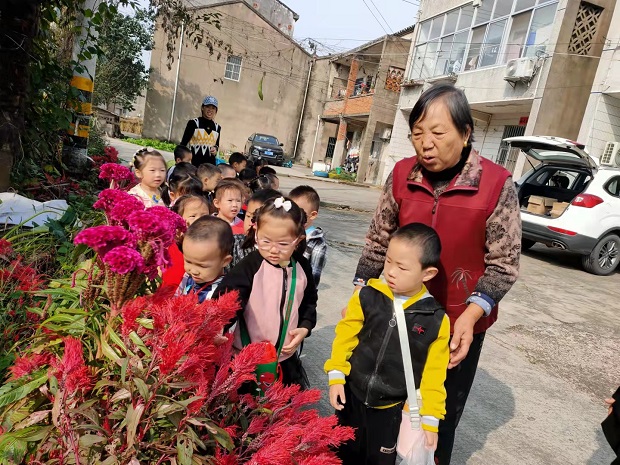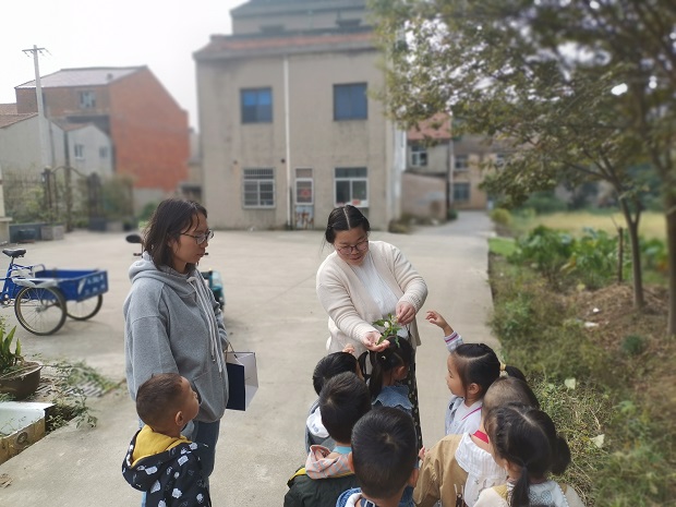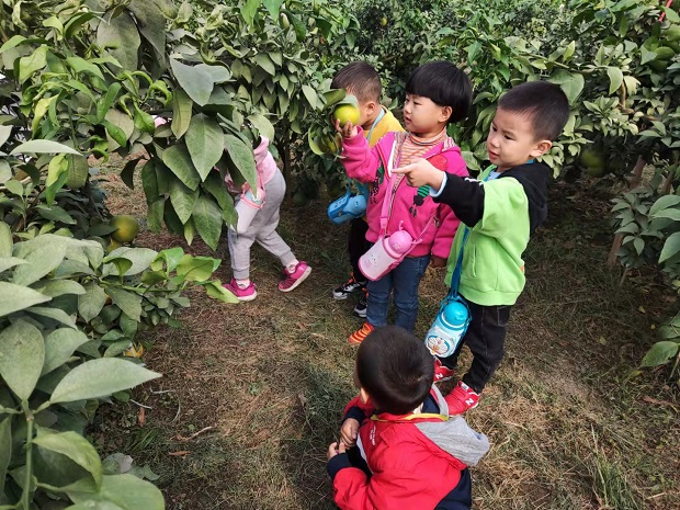 活动中,小班级组分成两组开展实践活动,各班教师则引导孩子们观察、发现、探索,了解周围事物因季节所产生的变化。小一班、小三班前往幼儿园周边果园,观察秋天的花、秋天的叶、秋天的果从而感受大自然中各种植物的变化培养幼儿热爱大自然的情感。小二班、小四班充分利用乡土资源,观察成熟的水稻、撑着大伞的芋头、压弯腰的黄豆、绿油油的青菜等,来让孩子近距离的观察果实、感受秋天。本次活动孩子们能通过摸一摸、看一看、闻一闻多感官的进行体验,与秋天来一场亲密的接触,增长了关于秋天的认识也体会到了人生中第一次社会实践活动的喜悦心情。