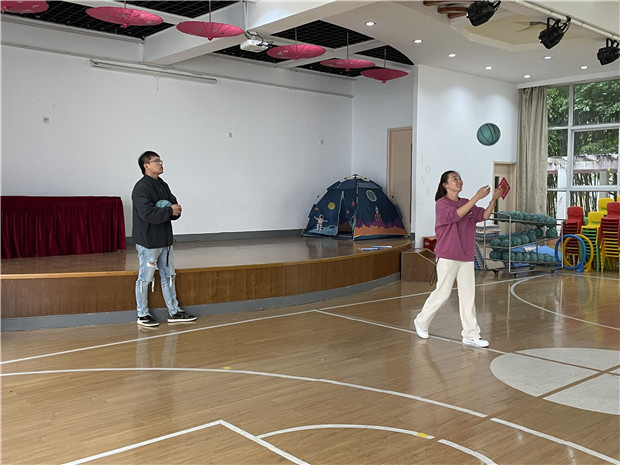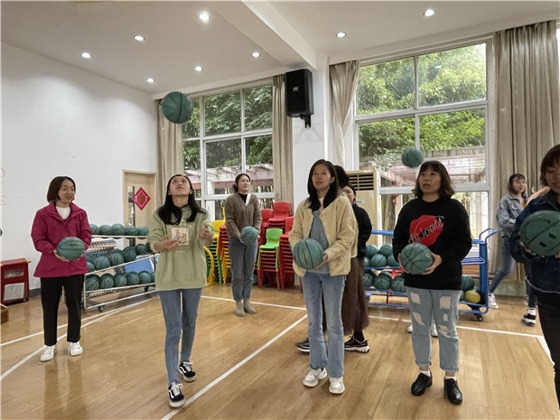 在这一环节中,先是由朱教练针对中班组幼儿户外游戏中篮球的玩球技能与游戏玩法,从最基本的滚球、抛接球、运球等一一进行了详细地讲解和示范,随后,老师们对逐个游戏玩法进行练习。在练习的过程中朱教练不断巡视老师们的练习情况,热心指导每位老师的动作和姿势,发现问题及时解答。老师们也珍惜学习机会,积极认真练习玩球技能与游戏玩法。