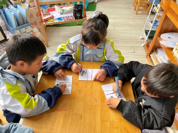 回到教室,孩子们马上拿起笔,把自己找到的秋天画下来,他们的笔下有桂花树、有松果、有秋叶等等。还有他们和小树比高、在小树林里和同伴做游戏嬉戏。孩子们突破自己原有的水平,进入自觉的、积极的学习状态中,激发起热爱自然和热爱生活的情感。