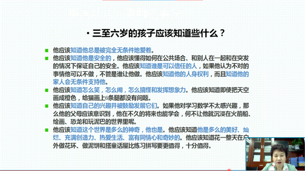 孙老师通过案例分析和对孩子心里特征解读,指出每个年龄段家长与孩子的关系。0—3岁父母是孩子的守护神,3—6岁父母是孩子的玩伴,7—10岁父母是孩子的教练,12—15岁父母要做孩子的朋友。