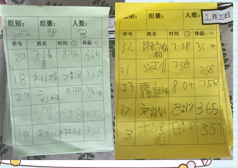 渐渐地,1.0版本的签到方式对于大班幼儿来说略显简单,幼儿的积极性逐渐降低。怎样提高自主签到的趣味性,帮助幼儿在自主签到过程中深度学习成了老师思考的首要问题。经过级组教研,大10班启用了2.0版签到表,2.0版签到表除了记录姓名外,还增加了入园时间、体温、生活物品,生活物品包括了书包、水杯、口罩、吸汗巾,这对幼儿的签到提出了更高的要求,每天早晨的签到处都会排起长龙。