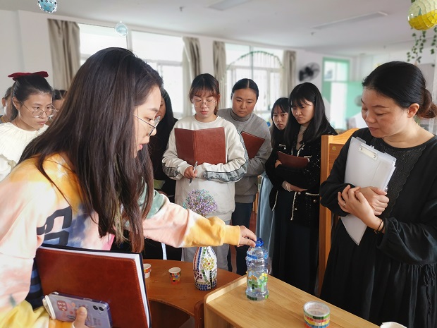 在观摩中大班的生活区中,卞园长根据各班创设内容提出了针对性的建议。她指出:老师们要把准生活区的立意,确立生活化、情趣化、诗意化的重点,分步实施,有节奏地缓缓推进,遵循“儿童在前,教师在后”的教育理念,形成富有情趣特色的趣味生活区。