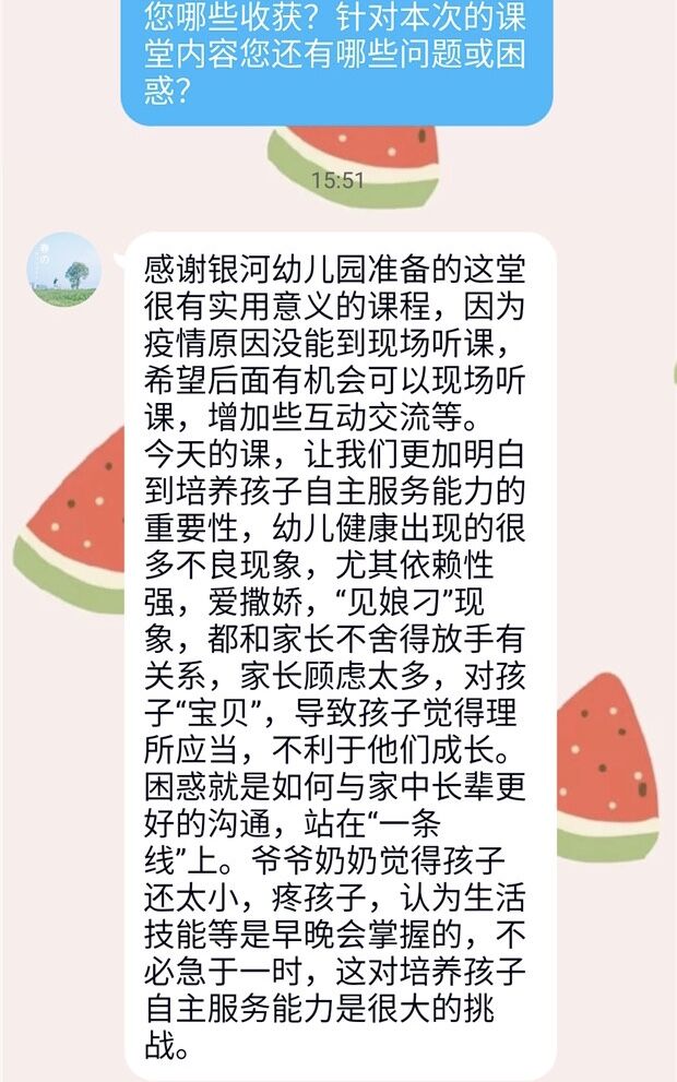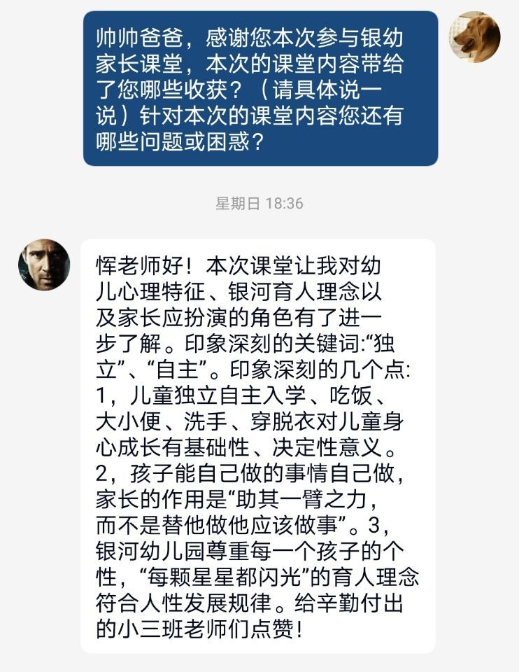在本次的父母课堂讲座结束后,家长们纷纷表示通过本次讲座,不仅理解了小班自我服务的重要性,更是在一个个生动、鲜活的案例中进行了一次沉浸式的倾听,在一个个具体的课程支架中形成了家园相互的理解与认同,两者之间架起了信任的桥梁。同时也期待在下一次的家长学校中能再相会、再学习。