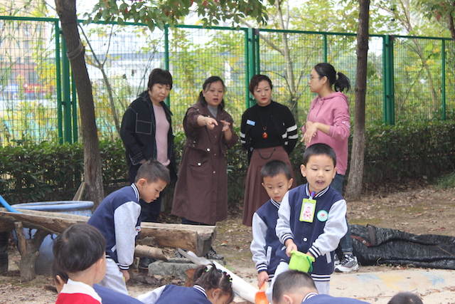 在户外混龄活动园本化实施的过程中,豪幼教师持续发力:学习研讨、持续调研、优化调整……这些努力都是为了给孩子们营造一个富有挑战、充满乐趣的户外游戏环境。今天,吴紫阳园长再次走进滨江豪园幼儿园,依次观摩户外各区域游戏现场,并与负责教师进行点对点的指导交流。如:场地的规划、材料的投放、玩法的更新等,吴园长都给予了贴地可行的建议,为下阶段的调整明确了思路及方向。同时,她也为豪园教师团队的成长表示了肯定与赞赏。