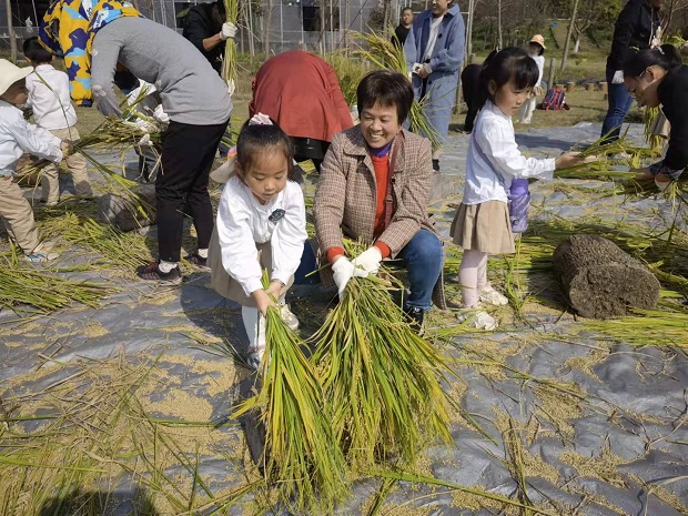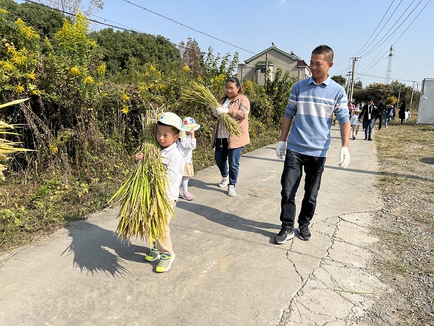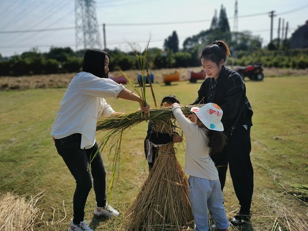 随后家长们列队踏进金黄色的稻田,戴好手套、拿起镰刀、俯身弯腰,铆足劲开割。伴随着孩子们的加油声和镰刀的 “嚓嚓”声,一把把稻穗渐渐在孩子们的面前堆积起来。割完稻子后,孩子们又忙着给稻谷脱粒,最后剩下的稻草,孩子们又在家长的带领下将其做成了稻草人,妙趣横生。