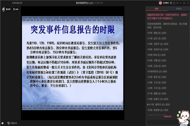戴老师详细讲述了突发事件信息报告的流程及内容和新冠疫情防控工作一日流程,重点强调了幼儿园室内外空气环境、物体表面、餐具等卫生清洁消毒要求和具体的操作方法,对幼儿生活游戏用品的具体消毒方法和特殊情况的处置给出了规范的指导。最后,戴老师介绍了师生返校条件,对教职工幼儿开学需要准备哪些材料进行了详细解读。