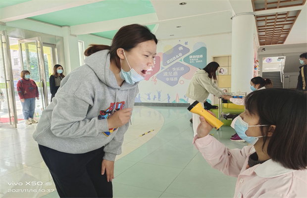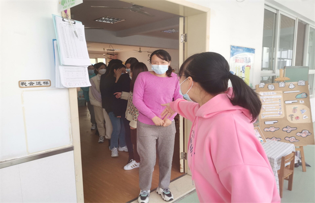 通道口由电子测温仪测量体温,体温正常者进入晨检区域,由保健教师通过一摸二看三问四查的流程对幼儿进行常规晨检。