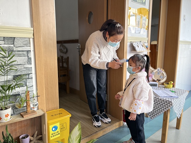 早晨7点40分,班主任老师在预审电子复学材料的基础上严审纸质复学材料,材料通过的幼儿和家长自觉佩戴好口罩站在一米线后排队,有序通过红外线人脸识别体温检测后入园晨检,进班前老师进行二次晨检并记录体温。虽然孩子们都是“犹戴口罩半遮面”,但从他们的眉眼间依然能看出喜悦与兴奋。