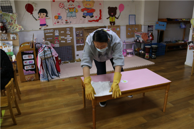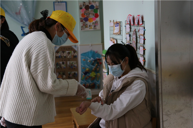做好全方位消毒,让每一环节健康有保障。幼儿分组就座,保持距离。室内活动每一环节做到每一名幼儿之间保持健康距离。室外活动开始,幼儿跟随班级老师分层分流下楼参加户外活动,对于期间出现不适(呕吐)等幼儿进行应急处置,每班配备呕吐包、专门配比的消毒水、三遍消毒覆盖流程以及对身体不适幼儿及其他幼儿的后续处置流程等都进行了演练、梳理和点评。