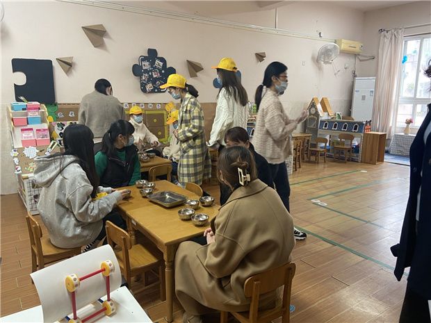 做到全时段检测,对每一名幼儿高度负责。教师全程佩戴戴口罩,楼层由固定人员电梯口取餐、送餐到各班门口并在所有班级用餐完毕后收餐。演练过程中,假定用餐时一名幼儿突然呕吐,保育员对呕吐物进行处理、消毒。班级老师上报年级组长,保健老师做好防护对呕吐幼儿进行体温测量,如超过37.3度以上立即带到校外隔离室隔离,安抚幼儿联系家长与上报工作同时进行。