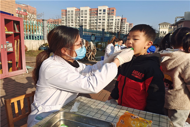 体检现场,医生们分工明确,态度温和,在做泡沫涂氟前对幼儿牙齿进行全面检查,然后将氟化泡沫的上下牙托放置幼儿口中,使氟化泡沫在幼儿口中停留一段时间,以达到氟化物预防龋齿的作用;老师们用鼓励、表扬的方式给予孩子们心理支持,营造了轻松的氛围,孩子们都能按照要求有序进行,顺利完成了幼儿的防龋齿治疗活动。
