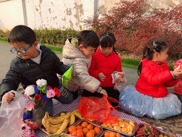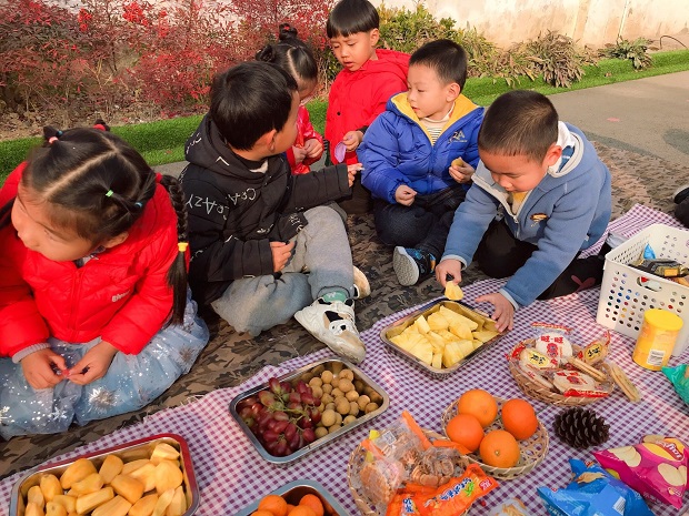 在诸多游戏中,最好玩的当属“欢乐音乐圈”:孩子们听着音乐一起围着圈圈奔跑,在奔跑时眼睛一直看着中间的圈圈,在音乐停止时停下来迅速找圈站好。在玩的时候孩子们神情专注,反应迅速,生怕抢不到圈。游戏玩累了,那就座下休息,补充能量吧!孩子们吃着美食,晒着太阳,和自己的老师、小伙伴聊着感兴趣的话题,感觉无比的惬意!