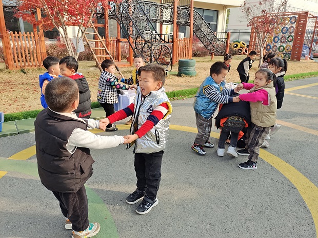 “冬日游园会”活动9点准时拉开序幕,孩子们排着整齐的队伍,兴奋的带着早就准备好的美食、野餐垫,来到了幼儿园的户外游戏场地,一起将野餐垫铺在地上,和自己的老师、好朋友们玩起了好玩的游戏:松鼠大树、撕名牌、猜拳跨步、欢乐音乐圈....,每一个游戏都充满了孩子们的欢声笑语。