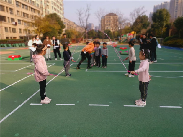 随后李文沛老师展示了《大班体育:浪花一朵朵》花样跳绳活动,孩子们两两合作摇绳变成一朵朵的浪花,其他孩子变成一艘艘的小轮船,体验从两根绳子穿过去的游戏挑战。薛佳妍带来的《大班体育:跳马小将》是一节体适能活动,以解救喜羊羊翻越小山的情景活动,孩子们学习用手撑跨的方式越过一定高度障碍物的方法,在运动中相互学习,共同掌握跨越的技能。