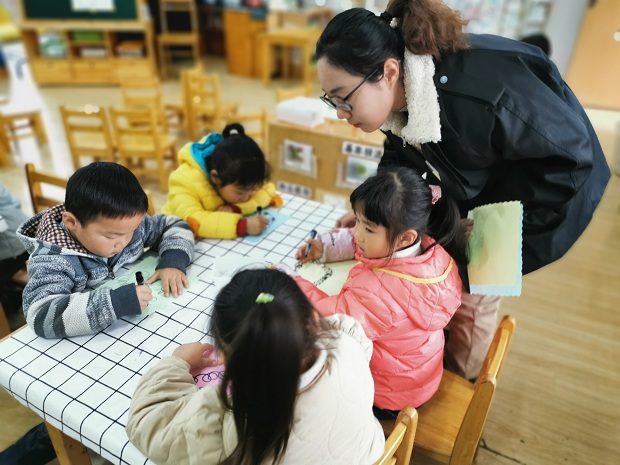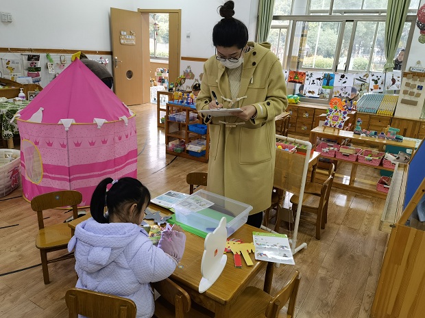 首先,帮扶小组观摩了各个班的区域游戏,肯定了我园在区域环创、学习故事等方面凸显季节性、互动性、整合性和开放性,也针对区域游戏材料的投放进行了详细说明与分析,结合各班存在的个别问题,提出了能够有效帮助和促进幼儿学习与发展的改进方法。在观摩了3名新教师的区域游戏分享后,肯定了老师们这半年的飞速成长,同时也提出了在提问和回应等方面存在的不足和改进策略,适当增加幼幼互动的机会。