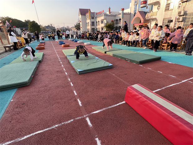 本次运动会分为三个环节。首先是班级律动展示,在《小猪佩奇》、《天天向上》等一首首轻快活泼的音乐中,小朋友们各个神采飞扬,动作有力,各班不仅编排了分组围圆、钻山洞、开火车等队形,更融入了开合跳、侧滑步跑等体操动作。接下来,中、大班小朋友分别进行了拍球和跳绳个人单项赛,小朋友们在比赛过程中积极投入,坚持不懈。最后,是结合《指南》动作发展目标和体操动作的走平衡木、提重物跑、直腿爬行等组合项目团体赛,赛场上的小小运动员们尽情挥洒汗水,台下的小观众们纷纷为其呐喊加油……操场上不时地响起阵阵掌声和欢呼声。