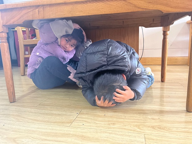 “呜......”,下午3:02分一声拉长的警报声响彻幼儿园。听到危险信号宝贝们立刻停止了活动,以最快速度钻到各自教室的桌子底下,有的快速移动到墙角、三角区域抱头下蹲。老师一边引导宝贝们躲避危险,一边指导他们正确的躲藏姿势:双手抱头,将身子藏在桌子底下。