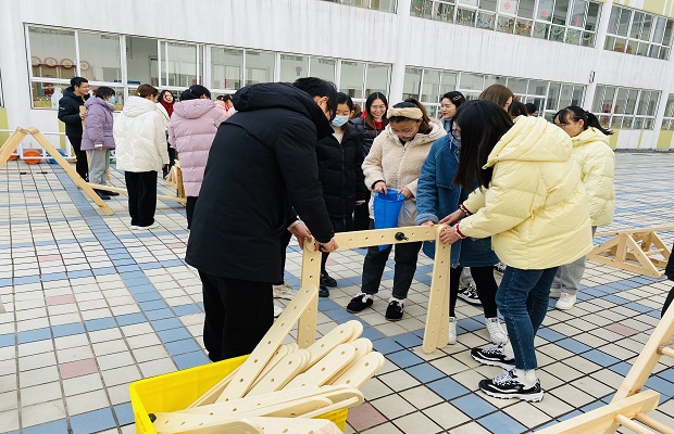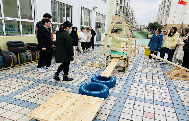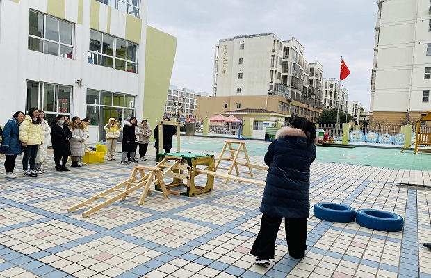 探索游戏区以《幼儿园教育指导纲要(试行)》和《3-6岁儿童学习与发展指南》为指导思想,以户外中大型木制器械为载体,幼儿通过开展运动类、角色类、操作类、综合类等形式的户外游戏,在具有挑战性、情境性、自主性的游戏场景中获得挑战、冒险、自由的游戏体验,促进身体素质提升的同时,实现能力的全方面发展。律叶老师带领全体教师从认识探索游戏区材料的整体结构,知道各类材料的名称到学习三种类型游戏的玩法,最后组织教师分为两组进行户外忆童探索游戏。在具体的操作过程中,律叶老师根据主题、幼儿的年龄特点、材料组合等方面进行了指导。