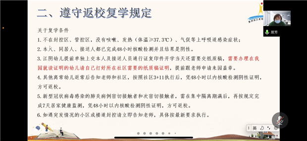良好的开端,是成功的一半,为确保复学工作顺利开展,居芳老师就配合做好核酸检测、遵守返校复学规定、做好个人防护工作、配合学校防疫工作、关注学生心理健康五个方面一一和大家讲解,希望全体教职工了解复学工作细则,做好本职工作,保障幼儿安全复学入园。