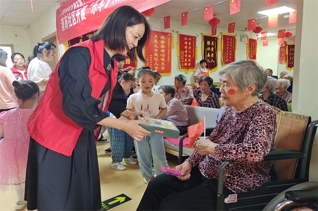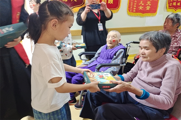 接着,小朋友们把准备好的重阳糕送到爷爷奶奶手中,并为老人们送上国旗、贴上了国旗贴纸,在表达自己心意的同时也为重阳节增添了一抹色彩,代表了幼儿园师生的一片心意和祝福,希望老人能够度过一个温暖的重阳节。