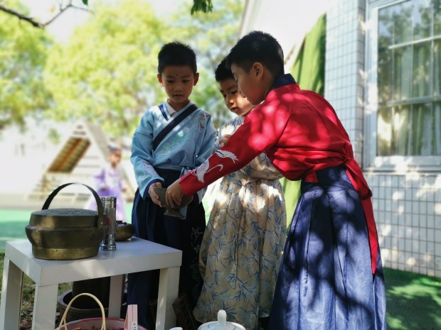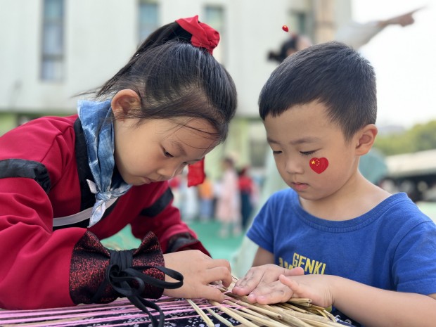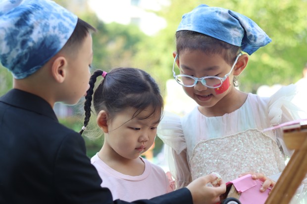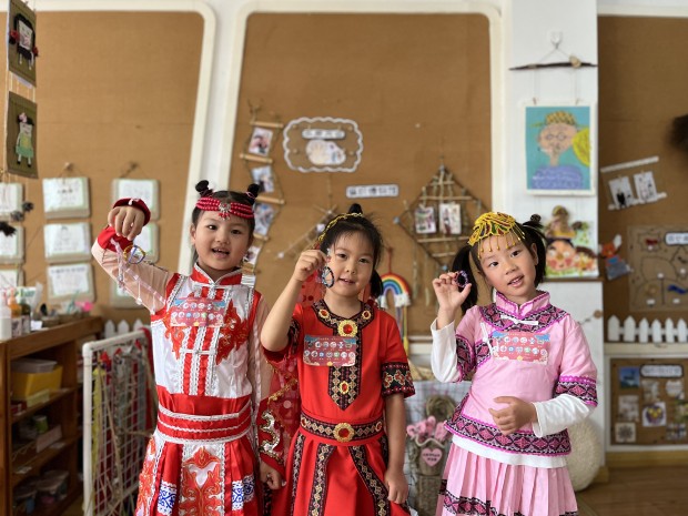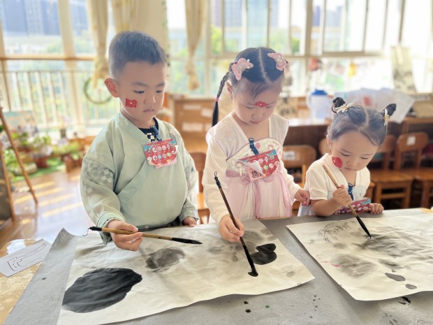在祖国妈妈生日来临之际,在节日氛围的渲染下,大班的孩子开启了“回溯名族历史,寻觅中华经典”之旅。水墨江南,绘一副卷轴画感受水墨晕染之美;古韵扎染,选一容器发现扎染与图案间的艺术关系;醉美汉服,着一身汉服展一场T台秀;中华盛饰,梳妆打扮后在集市舞台翩翩起舞……户外场地上“蹴鞠”、“投壶”等传统游戏龙娃们也尽情体验。热闹的幼儿园,多元的游戏场,快乐的龙幼娃!孩子们在游戏中探秘强国制造,在活动中感悟华夏智慧,在拓展中体味民族团结。