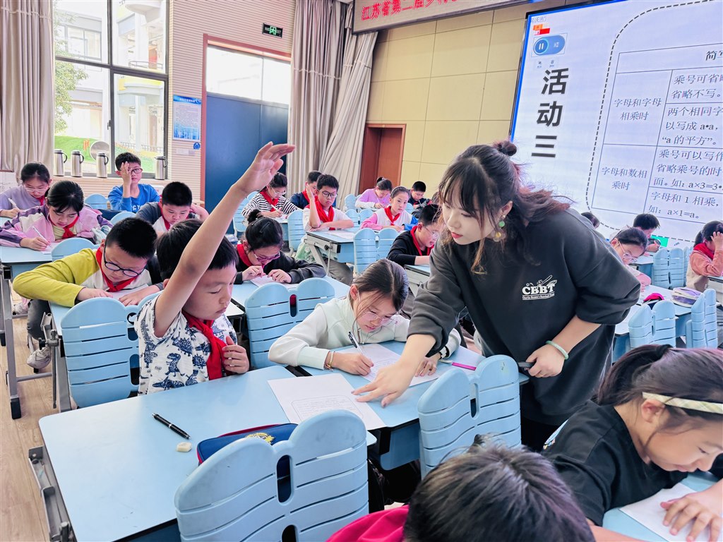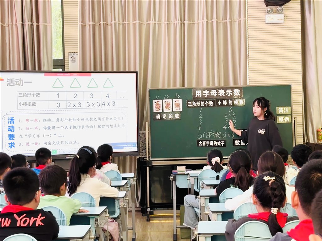 第二节课奔牛实验小学的颜琳老师呈现了五年级的《用字母表示数》,她带着学生在字母与数字的奇妙世界进行探索。颜老师让学生经历了用字母表示数的过程,学会了用字母表示一个量和数量关系,体会到用字母表示数的必要性和简洁性,整个教学过程从“具体”到“抽象”,从“确定”到“可变”,整个设计有梯度,通过各种形式的活动激发学生的学习兴趣,学生跃跃欲试,课堂气氛活跃。