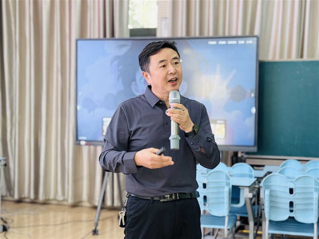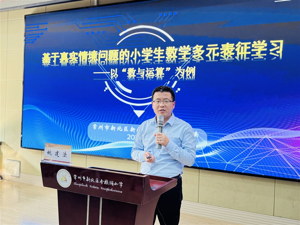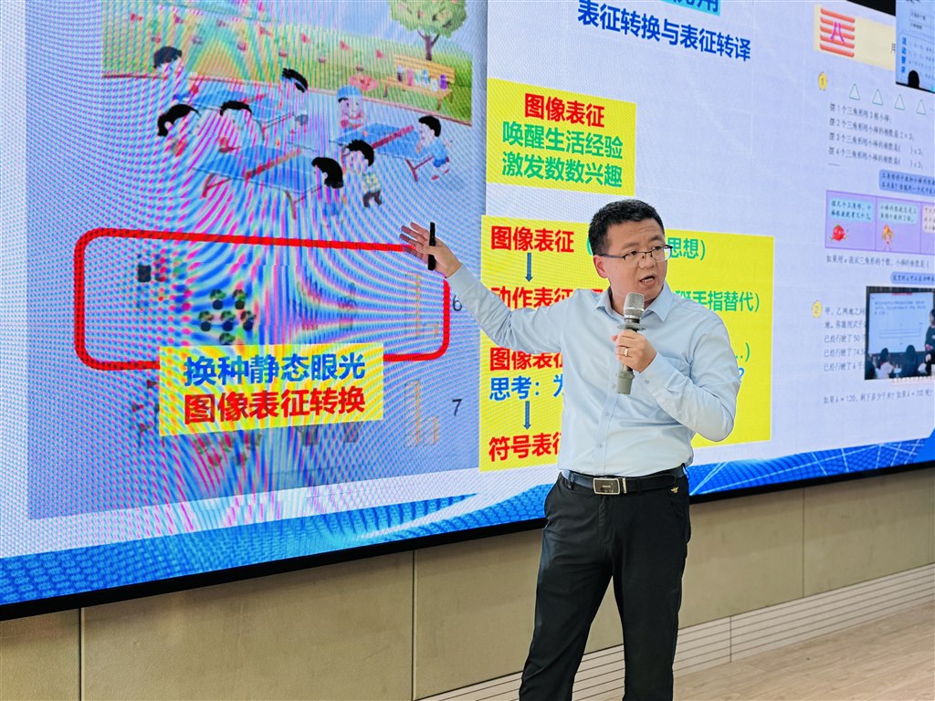 新北区卓越教师成长营领衔人姚建法校长作了题为《基于真实情境问题的小学生数学多元表征学习》专题讲座。姚特解释了真实情境问题与多元表征的内涵,提出要用真实的情境引发学生数学思考,促进学习方式的优化;数学多元表征具体表现为动作(让思维可感)、图像(让思维可视)、符号(让思维可思)表征等。小学生进行数学多元表征学习需要从数学直观到思维想象又回到数学直观。姚校长总结:多元表征学习是众多路径之一,关键要透过教材与表征,引导学生通过多元表征学习学会数学地思维。