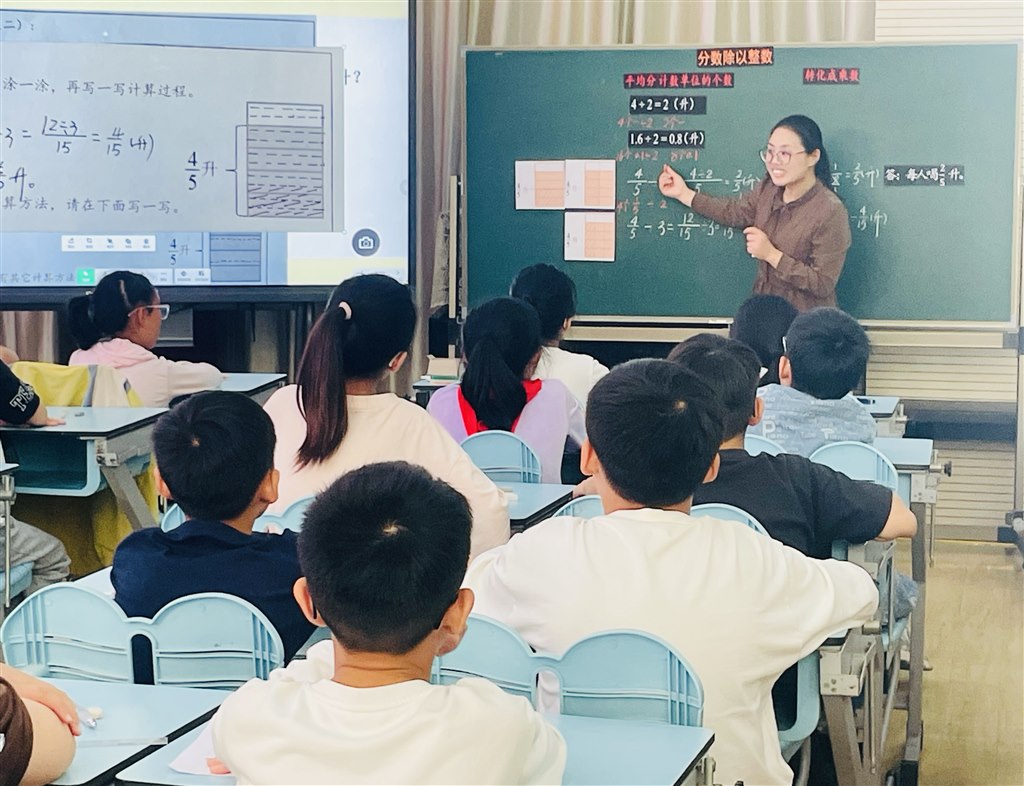 首先,香槟湖小学的郭琪霞老师给大家展示了一堂精彩的《分数除以整数》, 郭老师注重学生对算理的理解及算法的掌握,由整数除法、小数除法引出分数除法。接着通过分一分、涂一涂、写一写的活动让学生直观感受和理解数学运算背后的算理。整节课突出了以下三点,即:辨析算法,感悟运算一致性;细分单位,疏通分数除法通法;贯通联系,构建数运算模型,引导学生一步步深入理解分数的奥秘,领略“分数除以整数”的算理之美,感悟数运算的和谐统一。