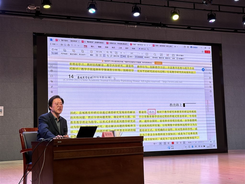 徐主任以“中小学教师如何做文献研究”为主题作专家讲座,从论文写作中的参考文献引用、论文写作中的文献研究、课题写作中的文献研究等几个方面进行阐述,徐主任指出,教育研究是一种认证辨理的活动,而文献研究是教育研究的必要环节,是教育研究的基础。侧重从课题文献研究进行深度剖析,对“文献综述、现状描述、进展评析、研究展望”这四个方面详细介绍了文献研究的基本思路、操作方法和实践过程。重点以自己的代表作为案例,详细解读“读、摘、转、缀、评”文献综述的方法和技巧。整个讲座展现的严密逻辑和精准表达让我们都深受启发,受益匪浅,徐主任让我们牢记要想跑得快,先学走得稳,最后,徐主任鼓励老师们在日常的工作中要坚持进行专业表达,过有道德、高品位的职业生活。这必将指导我们迈出更加坚实的教育科研研究之路。
