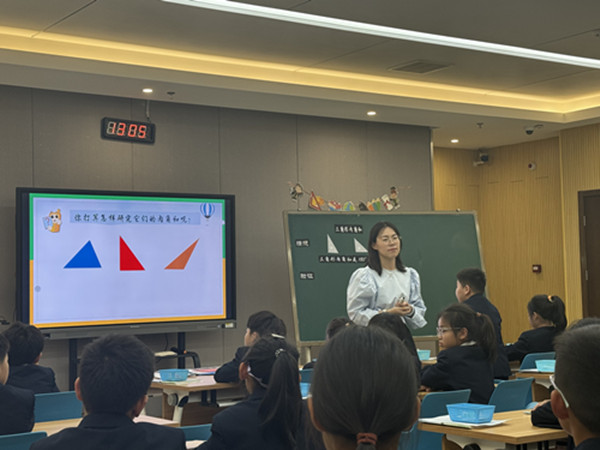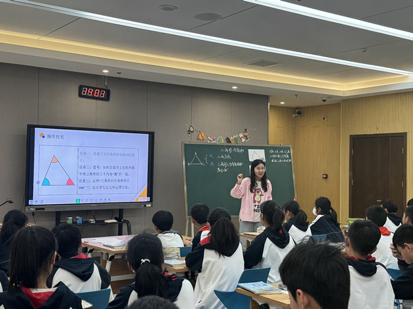 殷老师的课堂以“直观操作”为核心,通过让学生剪拼三角形纸片、测量角度等活动,引导学生从观察和实验中归纳出“三角形内角和为180°”的结论。课堂中,学生通过动手操作积累了丰富的活动经验,初步感知了几何图形的特性。