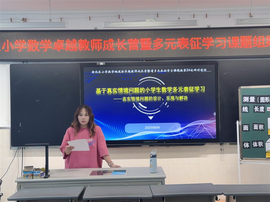 郭惠香老师带来《以“练”促“联”:基于真实情境与多元表征学习的小学数学复习实践》专题讲座,结合丰富课例,阐释如何在复习课中依托真实情境,通过练习串联知识,借助多元表征助力学生构建完整知识网络,学会建模,为复习教学注入新活力。最后,姚建法老师对活动进行总结,肯定老师们在真实情境创设与多元表征融合上的探索,也对后续教学实践提出更高期许,激励大家持续深耕课堂,让多元表征学习真正落地生根。
