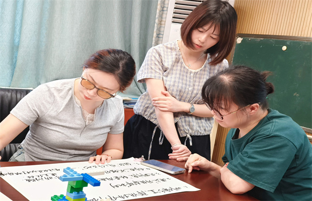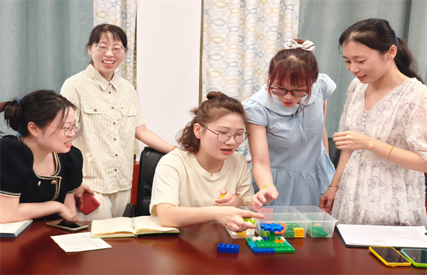会议伊始,一场别开生面的“教育基因重组”破冰活动迅速点燃现场氛围。教师们以小组为单位,利用乐高或磁力片搭建象征本组教育理念的立体模型。课程建设组以“金字塔”呈现课程层级,底层为省编生活化主题、中层是项目式学习、顶层为儿童本位理念。教师发展组用“风车”象征协作,中心轴为教师专业成长,叶片对应教师培养三层级。幼儿发展组以字母“A”寓意孩子独特,两翼为教师支持与家园社合作,中间是数字化技术。后勤保障组用“分水车”喻协作分配,核心为厨房 - 班级联动,管道是相关流程。