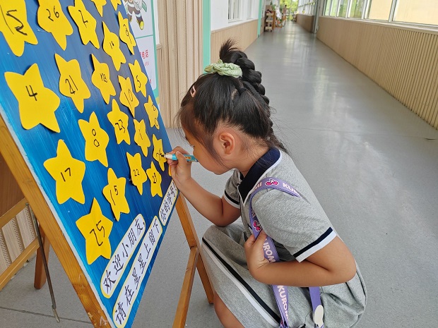 各班教室门口,老师们设计了丰富的迎新方式:有的班级播放着欢快的音乐,有的班级设置了升班签到墙,还有的班级让幼儿敲击小鼓象征“一鸣惊人”。这些精心设计的环节有效地缓解了幼儿的入园焦虑,让幼儿感受到幼儿园如家般的温暖。