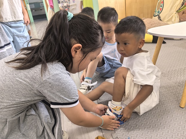 大班组开展了哥哥姐姐大带小活动,一对一结对照顾新入园的弟弟妹妹,帮助他们熟悉环境、参与游戏、穿鞋子、戳牛奶等。活动培养了大班幼儿的责任感与关爱意识,同时也让小班幼儿感受到了幼儿园大家庭的温暖。此外,大班孩子们回顾并分享了自己愉快的暑期生活,一起布置班级自然角,在孩子们的精心布置下,自然角布置得错落有致、别有韵味。