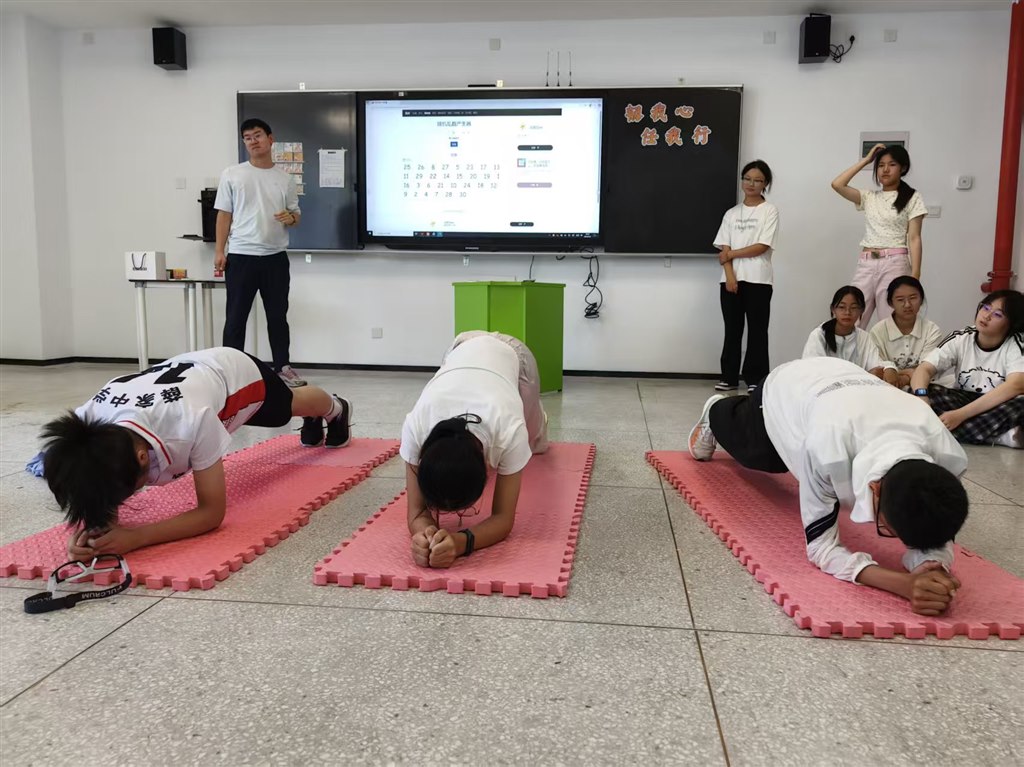 而一场别开生面的“韧性体能测验”——平板支撑挑战赛,则将教室内的气氛带向活动高峰。代表们咬牙坚持,同伴们呐喊助威,汗水与坚持诠释着:强健体魄亦是锻造心理韧性的坚实基石。