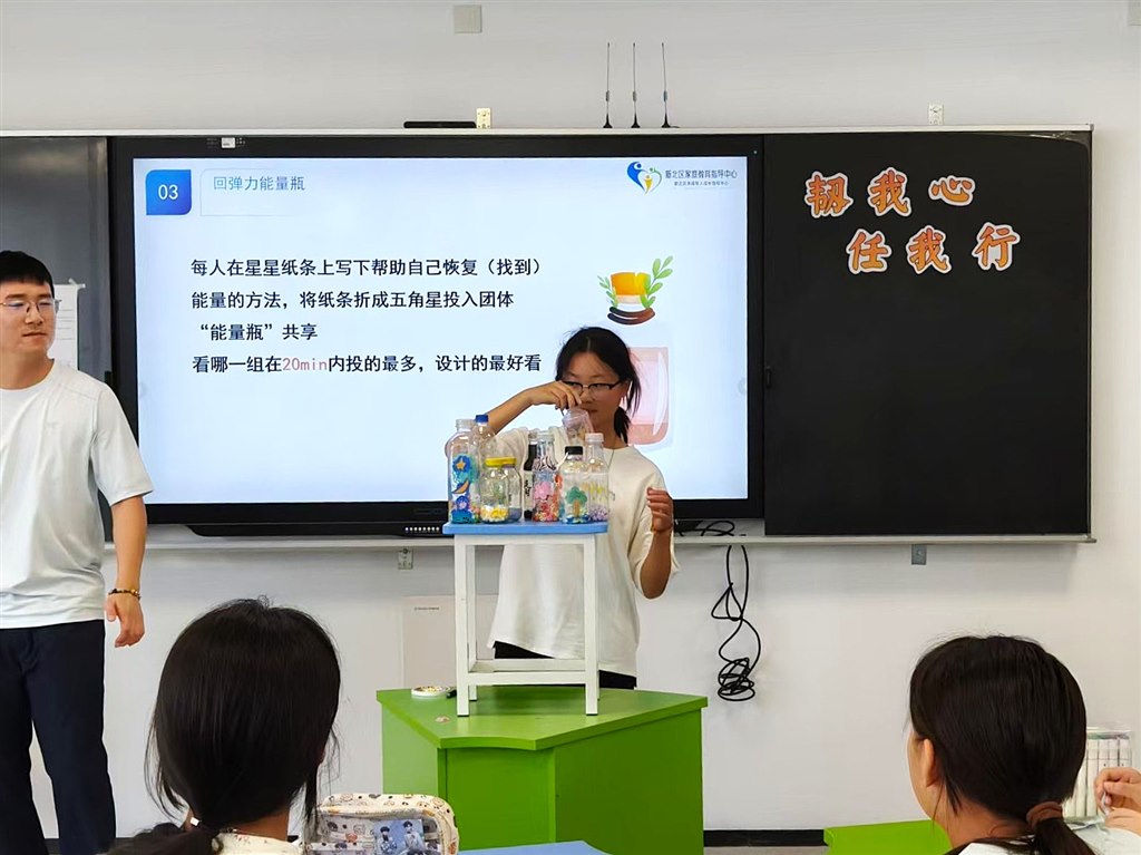 最温暖的一幕莫过于“回弹力能量瓶”的制作:孩子们认真写下“听音乐”、“找朋友聊聊”、“深呼吸十次”等专属抗压锦囊,将纸条折成星星,装入瓶中。这些承载着集体智慧的“能量瓶”,将置于校园一角,成为抚慰全校同学的心灵驿站。