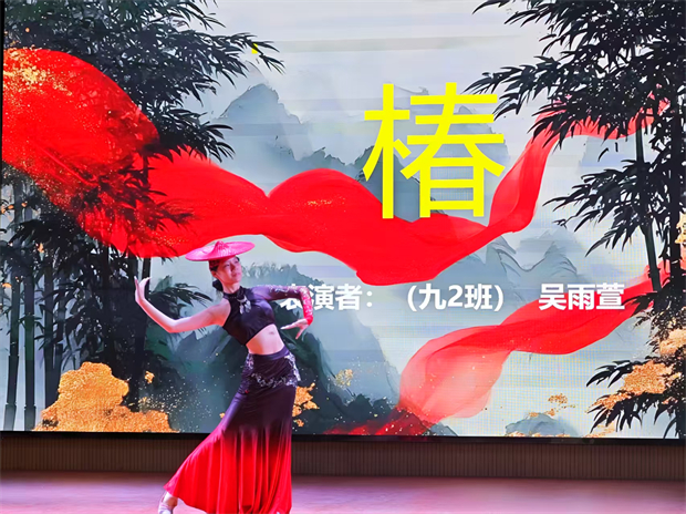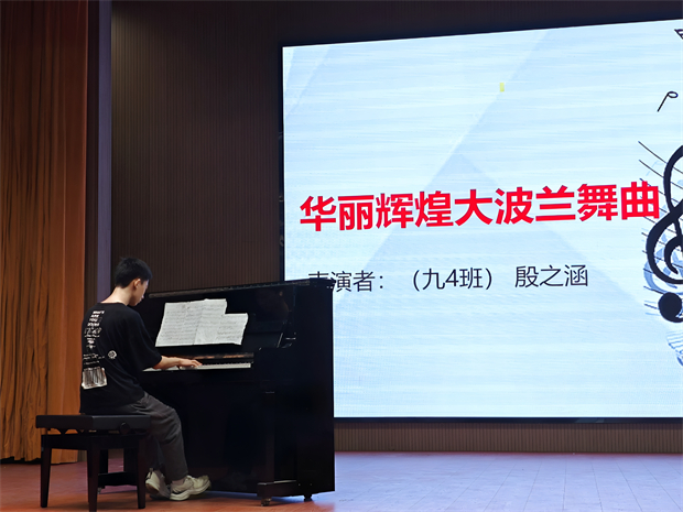 学生舞台,是青春最绚烂的注脚。九(6)班张甜甜一曲《我们的明天》,清澈的嗓音唱出了对未来的无限憧憬与希望,仿佛为前路铺满了星光。九(2)班吴雨萱的独舞《椿》,以柔美灵动的身姿,诠释着生命破土、向上生长的力量,宛如一幅流动的青春画卷。九(1)班徐恽语、孔玲涵、朱璐瑶带来的歌曲串烧《明天你好》+《奔跑》,从温情回望到全力冲刺,旋律的转换恰似从青涩走向坚定的成长轨迹,引发全场共鸣。由九(2)、九(5)班学子联袂献上的热舞《青春》,则以澎湃的激情和动感的节奏,点燃全场,淋漓尽致地展现了青春独有的热力与不羁,宣告着属于他们的时代正盛。压轴登场的是两段钢琴演奏,九(4)班殷之涵指尖流淌肖邦《华丽辉煌大波兰舞曲》,铿锵琴音震落窗边积尘;九(3)班窦欣蕊、恽天薇弹唱《最后一页》,琴声悠扬,歌声低徊,为初中这本厚重的书,轻轻合上了充满眷恋与回味的终章。